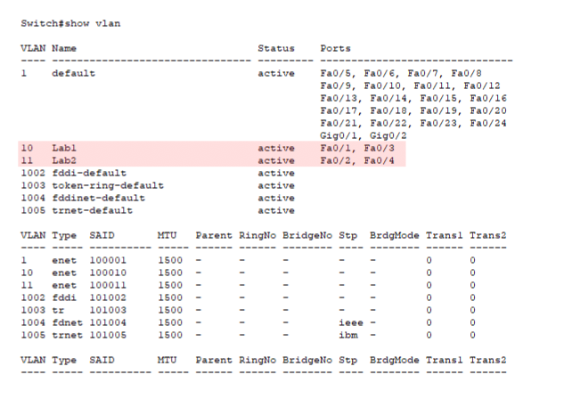 Kita akan membuat VLAN dengan nama Lab1 untuk VLAN ID 10 dan Lab2 untuk VLAN ID 11.