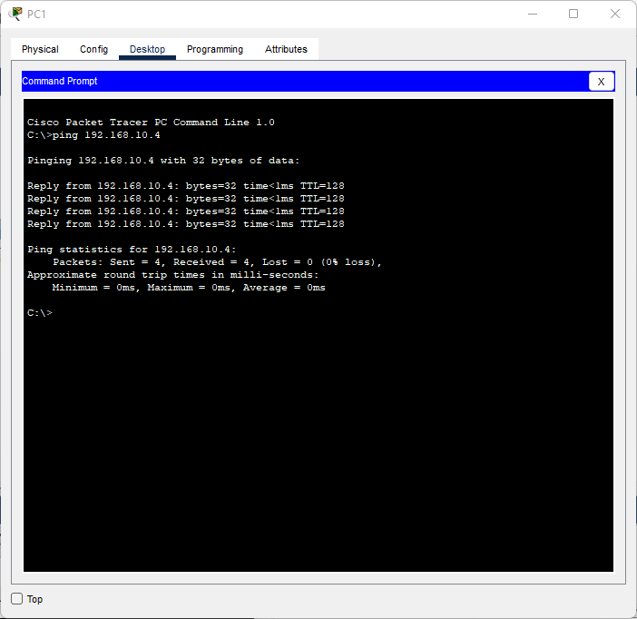 | PC3 | 192.168.10.4 | 255.255.255.0 | 192.168.20.1 | 10 |