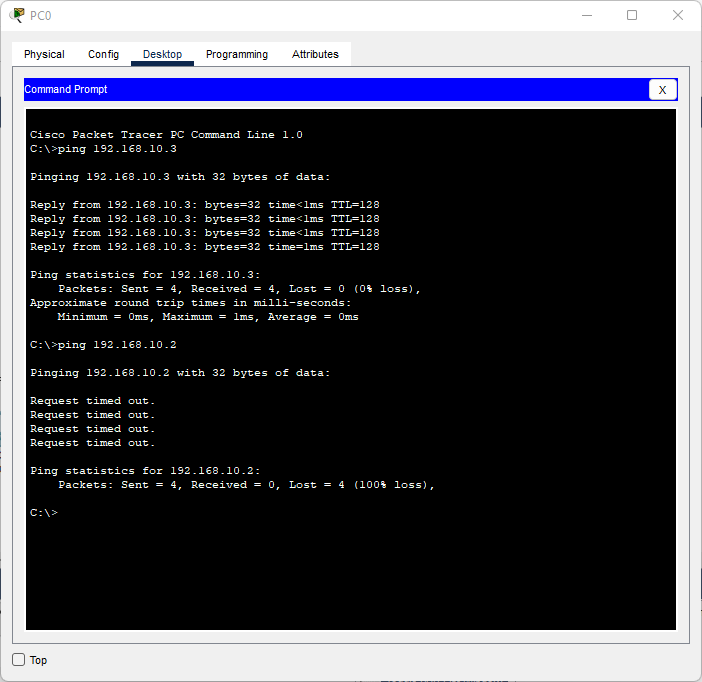 | PC0 | 192.168.10.1 | 255.255.255.0 | 192.168.10.1 | 10 |
