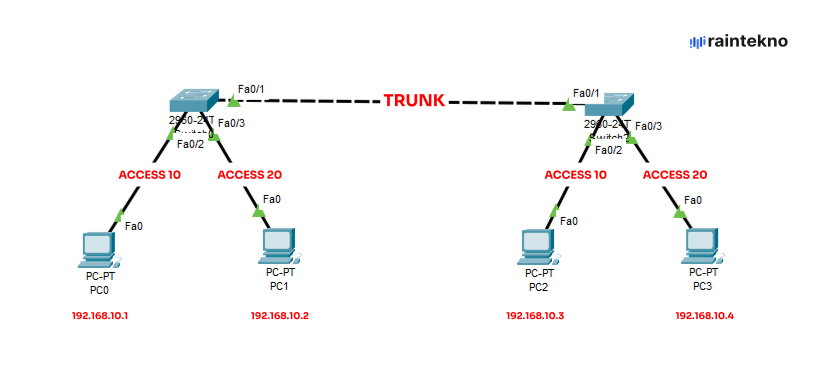 Pada artikel sebelumnya kita telah mengetahui cara konfigurasi VLAN access pada Switch di Cisco Packet Tracer. Dimana kita menghubungkan beberapa PC dalam satu Switch yang sama menggunakan VLAN.