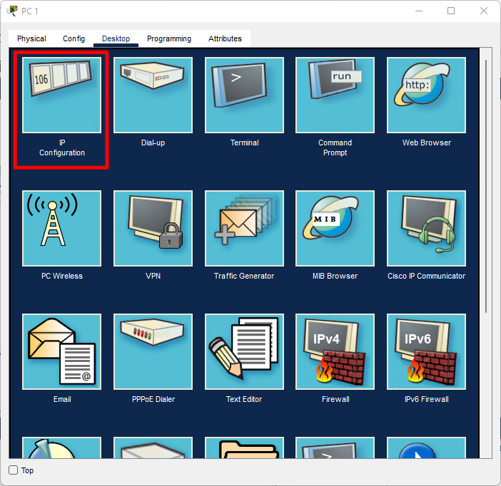 Untuk melakukan setting IP Address pada setiap PC. Silakan klik PC, kemudian menu Desktop, pilih IP Configuration.