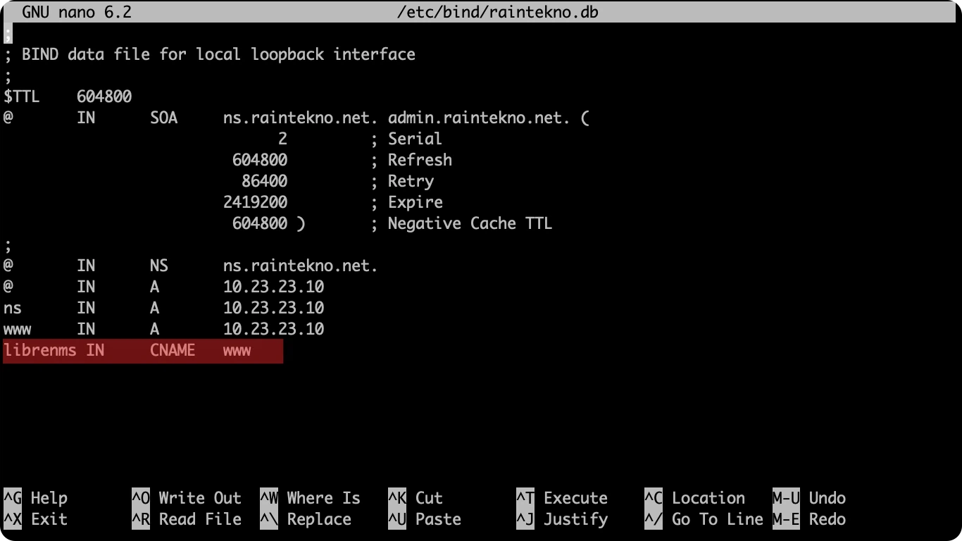 Buka file raintekno.db, dan tambahkan record CNAME untuk librenms.
