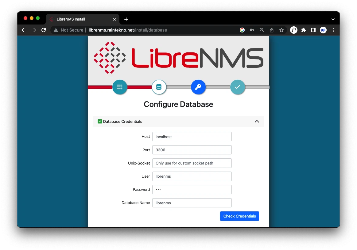 Selanjunya, kita harus mengisi konfigurasi database. Isi sesuai dengan data pada saat konfigurasi database sebelumnya. Kemudian klik Check Credentials.