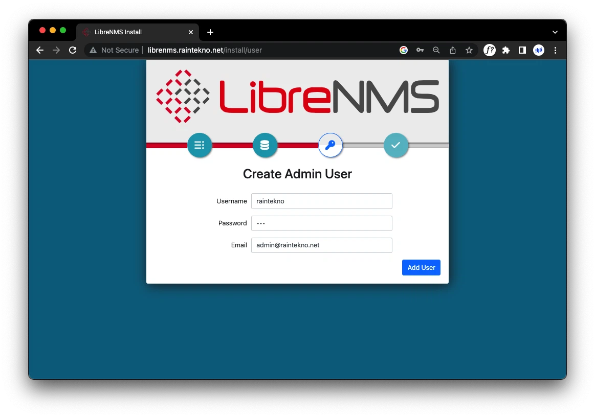 Klik icon kunci lalu masukan username, password, dan email yang akan kita tambahkan di Librenms. Kemudian klik Add user.
