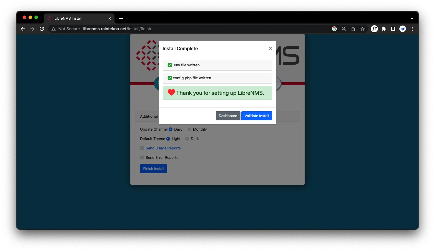 Akan muncul tampilan pop up seperti berikut. Klik Dashboard untuk menuju ke halaman login Librenms.