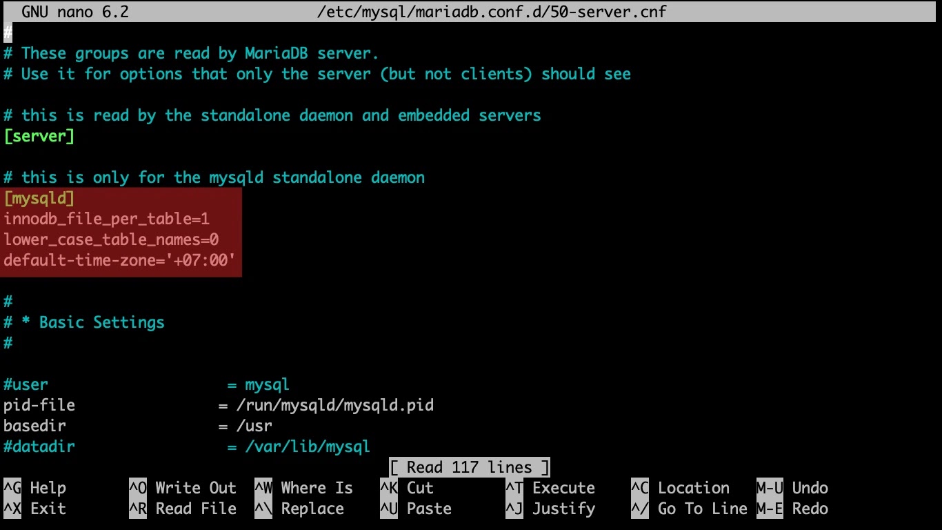 Edit file /etc/mysql/mariadb.conf.d/50-server.cnf kemudian tambahkan konfigurasi berikut ini setelah [mysql].