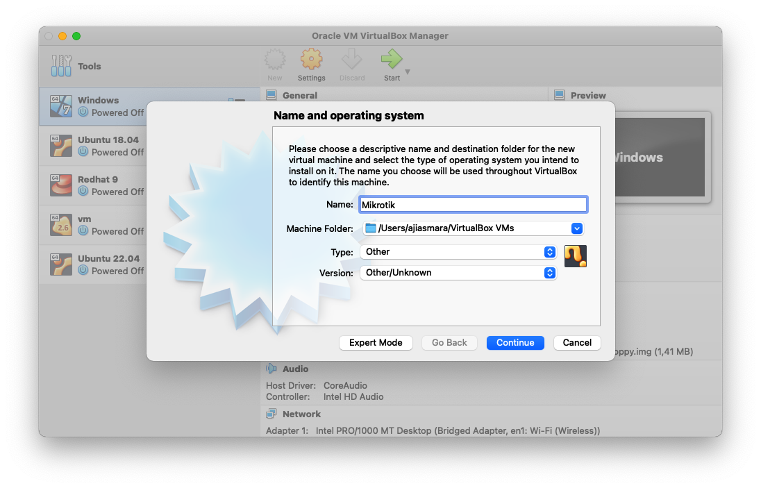 Buka aplikasi VirtualBox, klik icon New kemudian isi kolom nama dengan Mikrotik, Type dan Version pilih Other. Klik Continue.