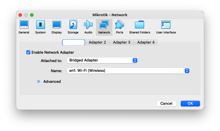 Khusus untuk adapter 1, kita pilih Bridged Adapter agar mesin virtual RouterOS terhubung langsung dengan sistem operasi host dalam hal ini MacOS ataupun Windows.