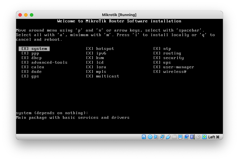 Setelah proses booting, muncul tampilan untuk memilih package yang akan kita install pada mesin virtual RouterOS.
