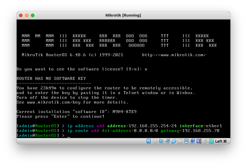 Terlihat pada gambar, Mikrotik RouterOS yang kita instal hanya bisa digunakan selama 24 jam. Setelah waktu tersebut, kita tidak bisa lagi mengoperasikan mesin virtual RouterOS tersebut.