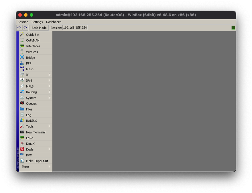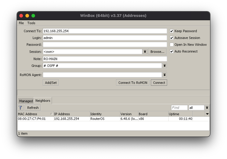 Sekarang kita bisa melakukan konfigurasi mesin virtual Mikrotik RouterOS menggunakan Winbox.