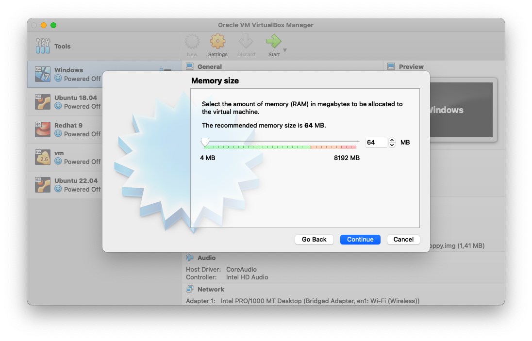 Selanjutnya kita atur ukuran RAM yang akan kita gunakan untuk RouterOS. Kita isi 64 MB saja sudah cukup. Klik Continue.