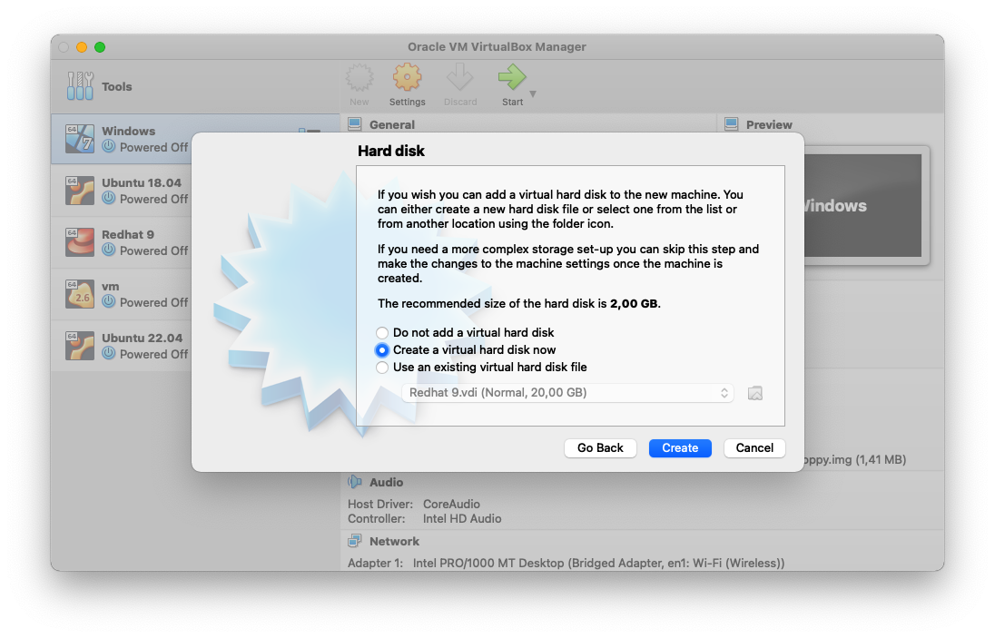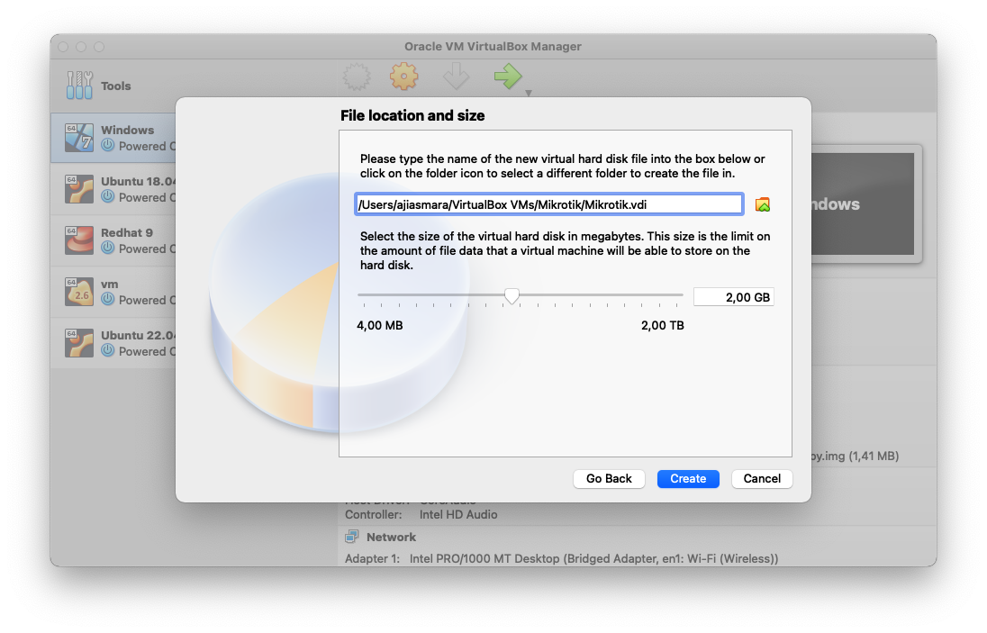 Selanjutnya kita atur ukuran hard disk yang akan kita gunakan. Untuk RouterOS tidak terlalu membutuhkan ukuran hard disk yang besar, kita cukup mengalokasikan sebesar 2GB. Klik Create.