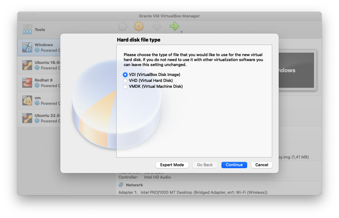 Pilih type hard disk yang akan dibuat. Kita pilih VDI (VirtualBox Disk Image) karena kita hanya akan menggunakan hard disk ini hanya di aplikasi VirtualBox. Klik Continue untuk melanjutkan.