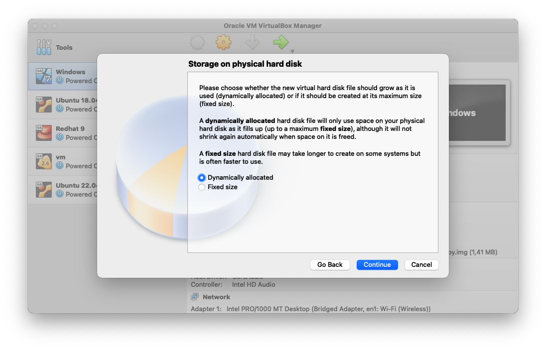 Pada pilihan Storage on physical hard disk kita pilih Dynamically allocated. Klik Continue.