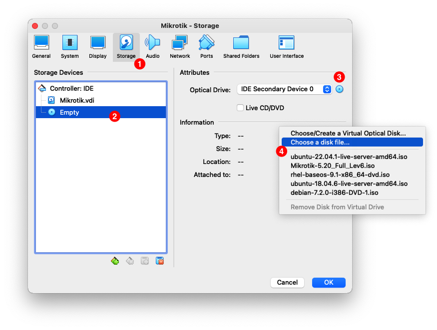 Kita akan memasukan iso image yang sudah kita download tadi ke dalam mesin virtual kita. Sehingga nantinya mesin virtual RouterOS akan booting menggunakan iso image yang dipilih. Untuk langkah-langkahnya bisa kita lihat pada gambar berikut ya.