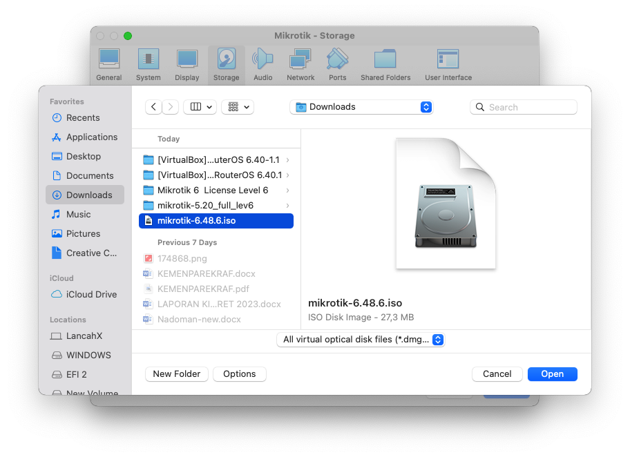 Sebelumnya kita harus melakukan download RouterOS image dari situs resmi Mikrotik di https://download.mikrotik.com/routeros/6.48.6/mikrotik-6.48.6.iso.