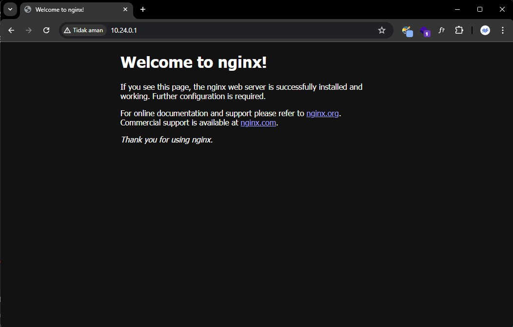 Kita tes apakah container Nginx yang sudah kita buat berjalan dengan normal. Akses alamat IP dari veth1-nginx yang sudah kita konfigurasi di awal.