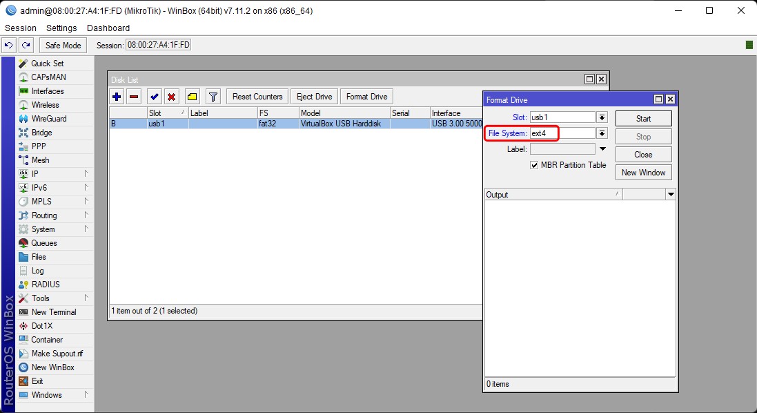 Pilih slot yang terdeteksi yaitu usb1 dan pilih ext4 pada File System. Klik Start.