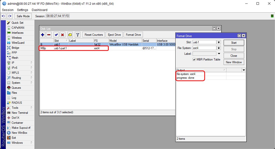 Pada umumnya storage pada Mikrotik terbatas, sehingga kita membutuhkan storage tambahan untuk penyimpanan container. Disini kita akan simulasi menambahkan storage tambahan melalui USB.