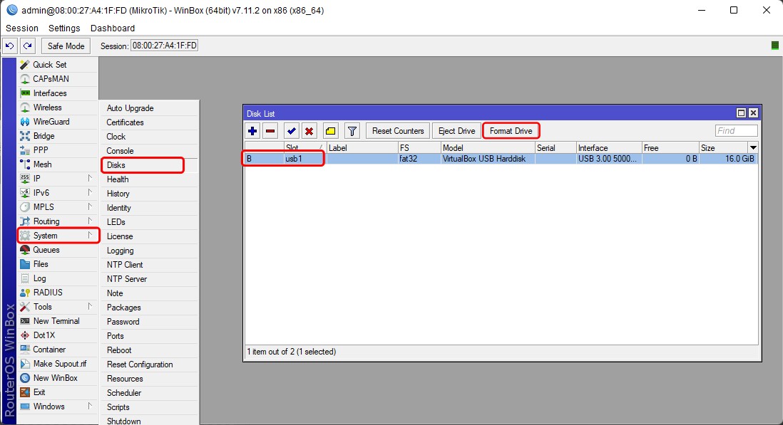 Klik System > Disk, kemudian pilih USB Flash Drive yang terdapat pada list disk. Klik Format Drive untuk melakukan format pada USB.