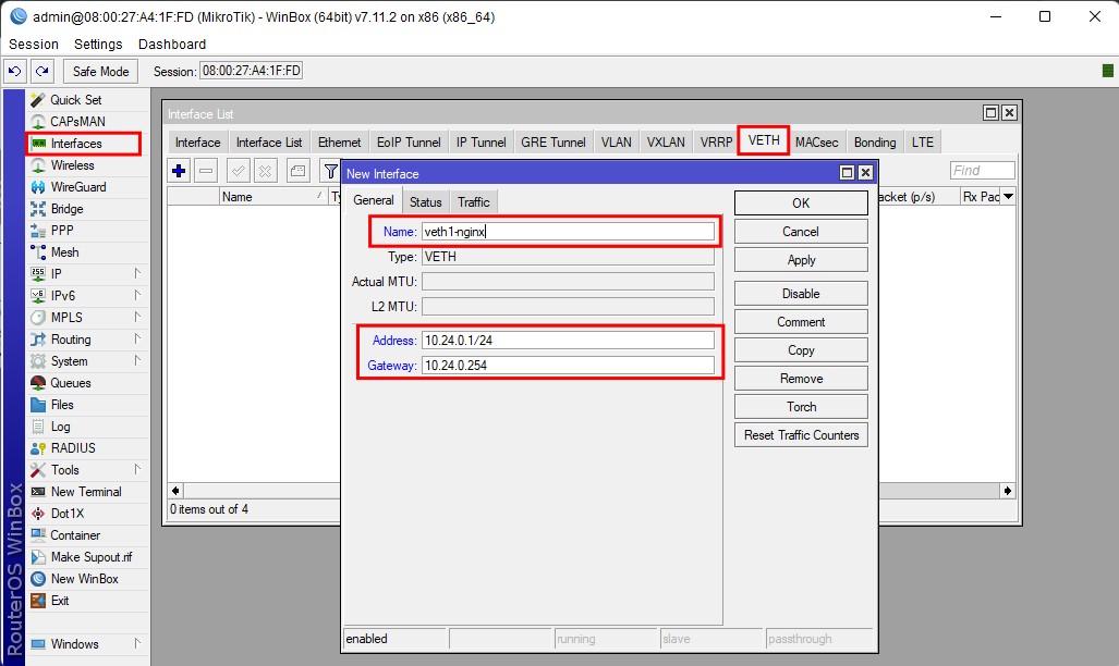 Klik Interfaces > VETH, kemudian buat 1 virtual ethernet baru dengan detail sebagai berikut.