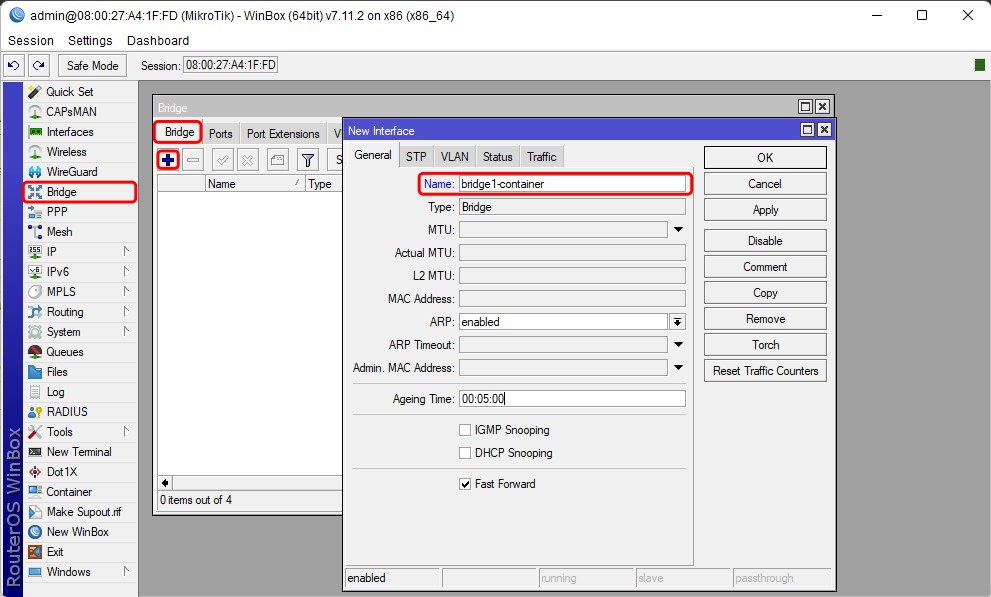 Kemudian kita buat interface bridge yang akan digunakan sebagai gateway dari interface veth1 container. Klik interfaces > Bridge, dan tambahkan bridge baru dengan detail seperti gambar berikut.