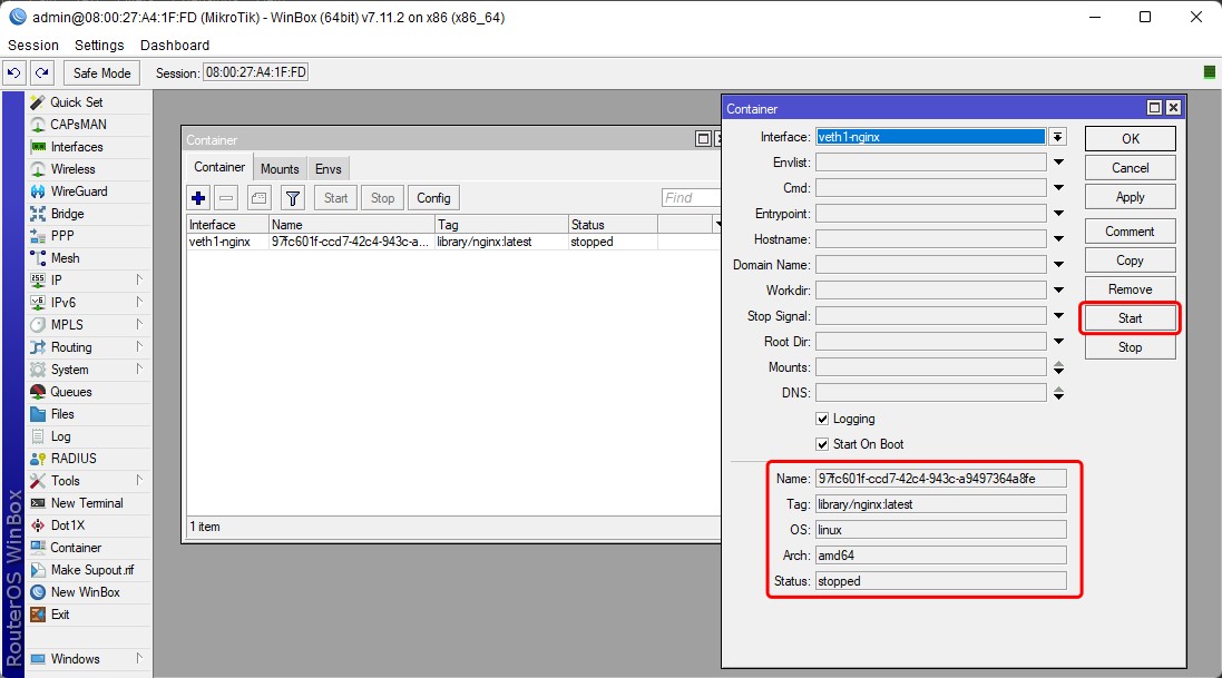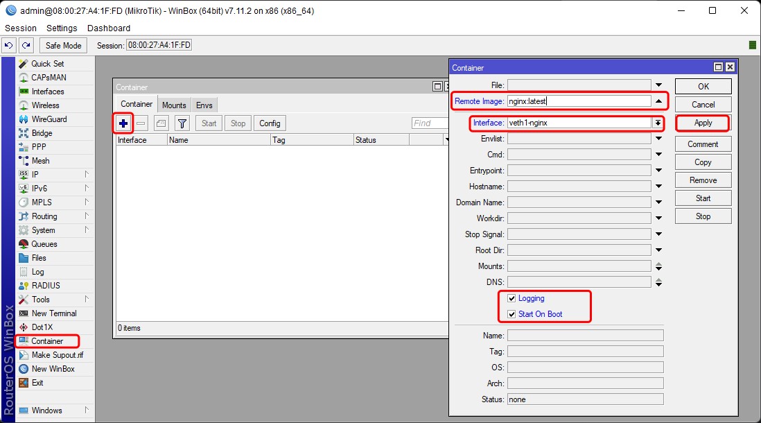 - Start on boot : agar container berjalan secara otomatis saat Router booting atau merestart.