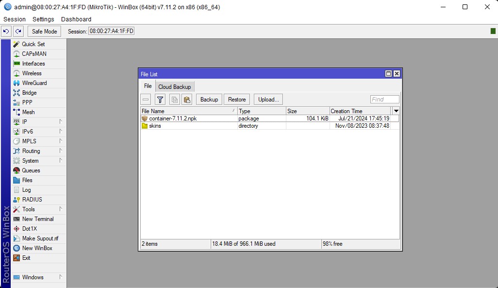 Setelah kita unduh dan ekstrak, cari file container-7.11.2.npk kemudian drag n drop ke bagian Files di Winbox. Dapat dilihat pada gambar berikut ini.