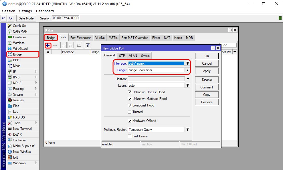 Tambahkan interface veth1-nginx ke dalam bridge bridge-container. Pada menu Bridge, pilih Port, kemudian tambahkan interface veth1-nginx.