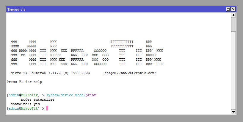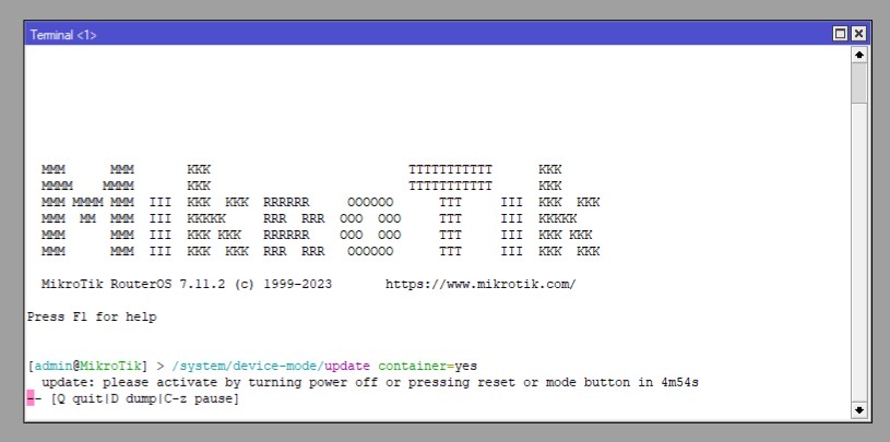 Selanjutnya kita perlu mengaktifkan mode Container pada Mikrotik dengan memasukkan perintah berikut ini di Terminal Winbox.