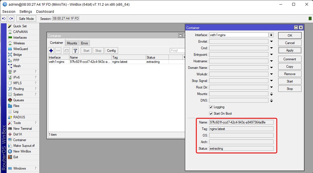 Kita bisa lihat statusnya extracting, artinya Mikrotik sedang melakukan proses pulling image ke Docker.