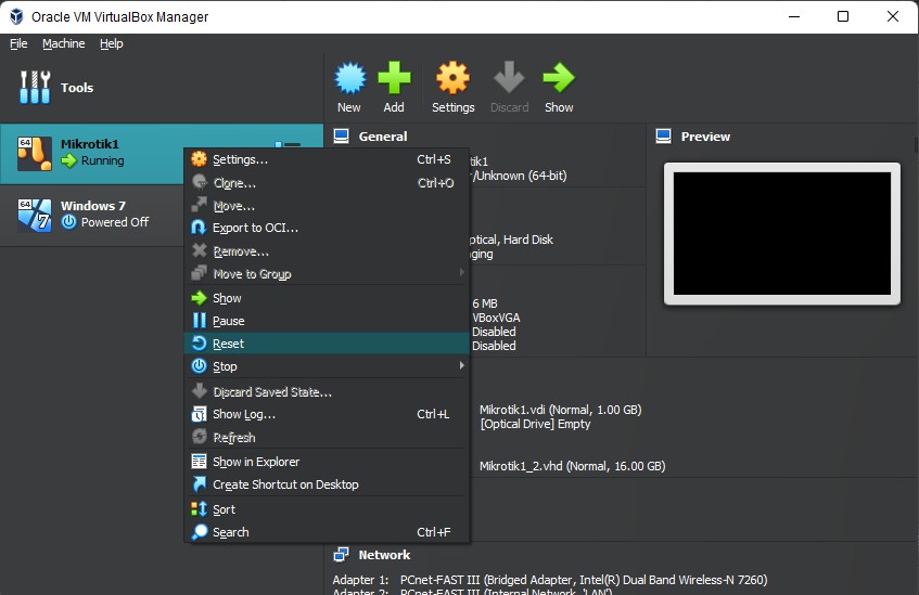 Agar mode Container aktif, kita perlu melakukan reset melalui VirtualBox dengan cara klik kanan pada nama mesin virtual Mikrotik, kemudian klik Reset.