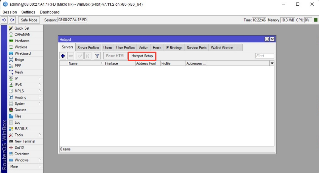 Selanjutnya kita konfigurasi hotspot dengan cara klik menu IP > Hotspot, lalu klik Hotspot Setup.