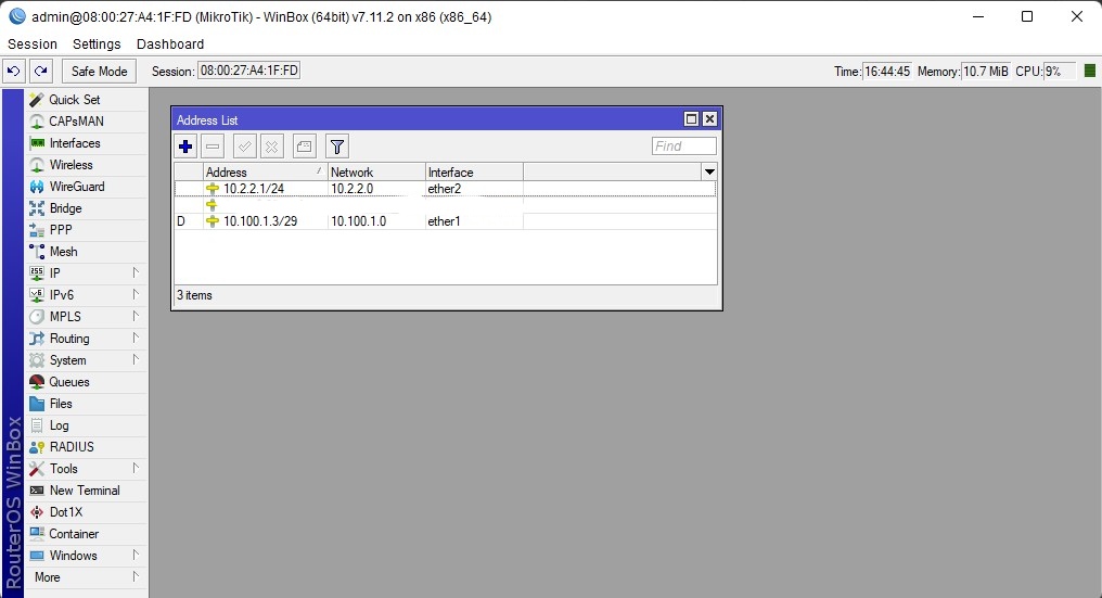 Pertama, kita konfigurasi alamat IP 10.2.2.1/24 pada interface ether2 yang akan kita hubungkan dengan Access Point nantinya.