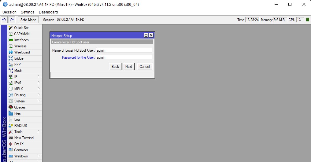 Selanjutnya kita akan diminta untuk membuat username dan password untuk login ke jaringan hotspot Mikrotik. Disini kami membuat username admin dengan password admin.