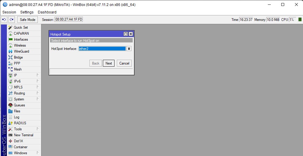 Selanjutnya kita pilih interface ether2 sebagai interface Hotspot, klik Next.