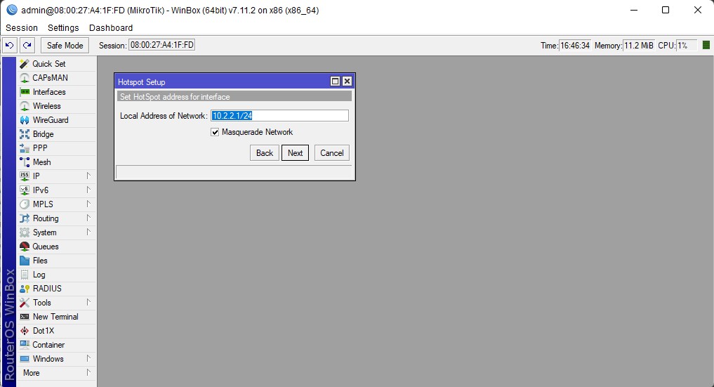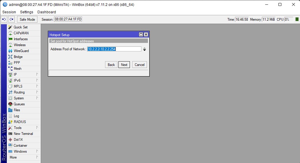 Lalu kita alokasikan alamat IP yang akan diberikan kepada user hotspot. Disini kami menggunakan prefix /24 sehingga alamat IP nya 10.2.2.2 – 10.2.2.254. Klik Next.