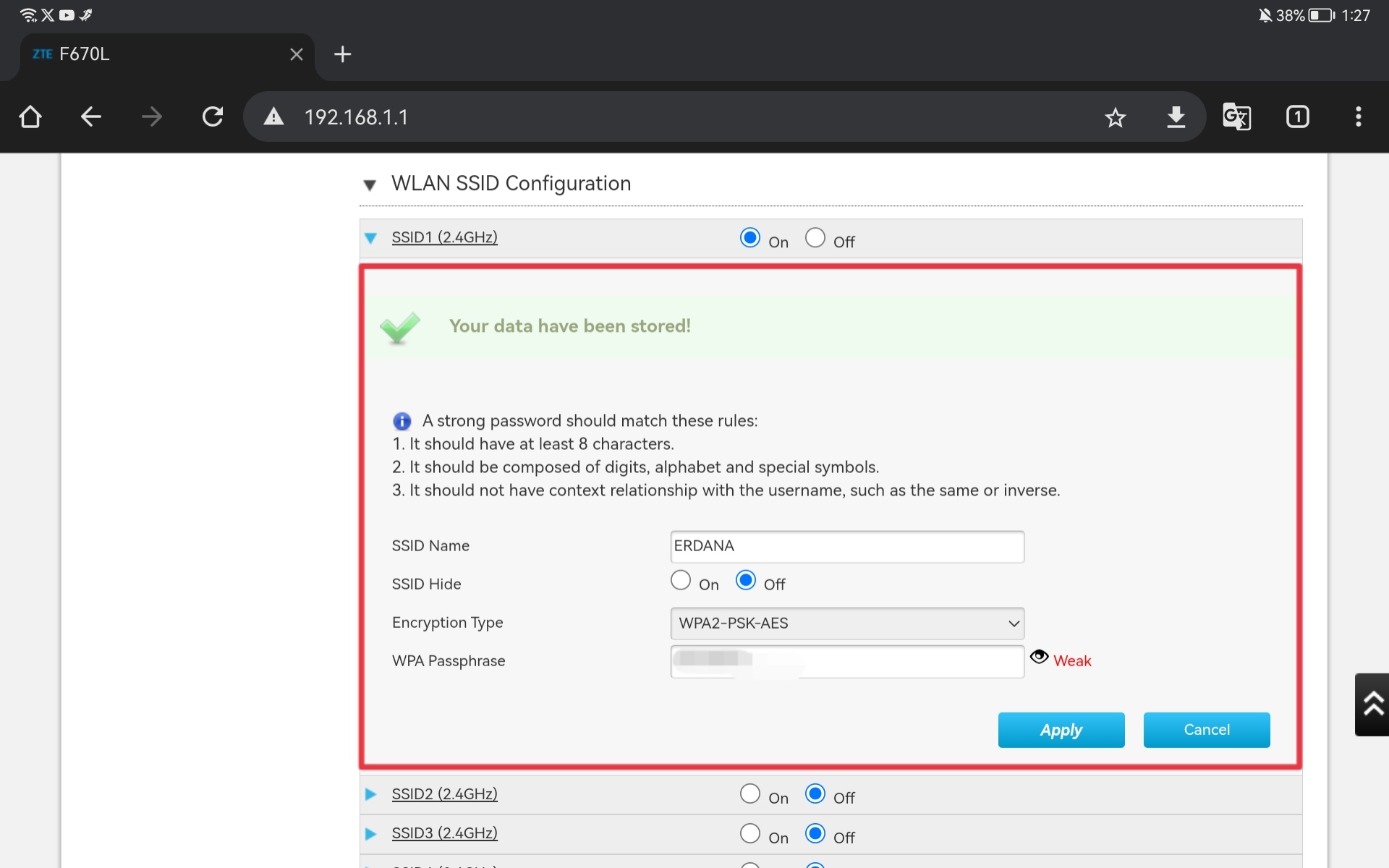 Gulir ke bawah dan klik WLAN SSID Configuration. Di bawah ini bisa kita lihat ada nama WIFI dan password yang digunakan saat ini.