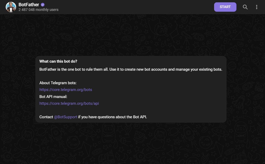 1. Cari bot dengan nama @BotFather, kemudian mulai dengan klik tombol Start atau ketik chat /start.