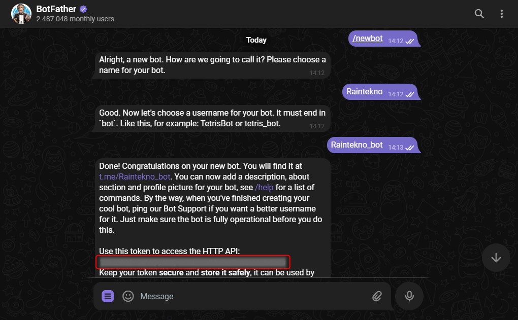 2. Kita buat bot Telegram dengan mengetik perintah /newbot. Kemudian kita akan diminta untuk membuat nama dan username bot, disini kita akan buat nama Raintekno dan username Raintekno_bot.