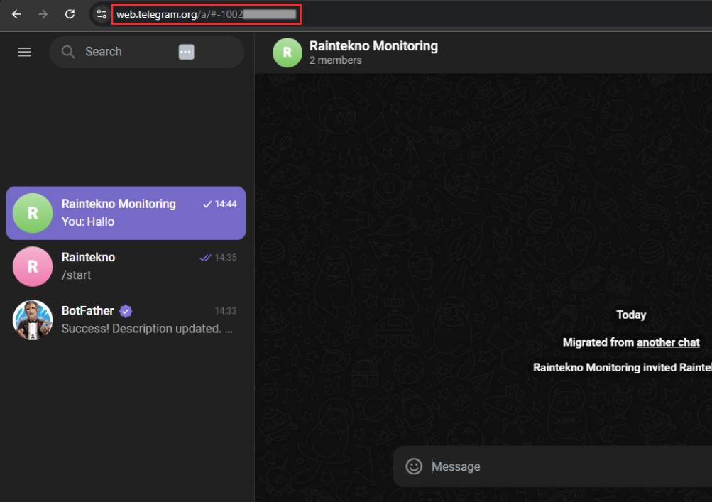 5. Selanjutnya kita perlu mengetahui chat id grup yang sudah kita buat agar bot Telegram secara otomatis mengirimkan pesan notifikasi ke grup kita. Caranya login ke web.telegram.org dan klik chat grupnya. Maka akan muncul chat id pada address bar setelah alamat https://web.telegram.org/a/chatid