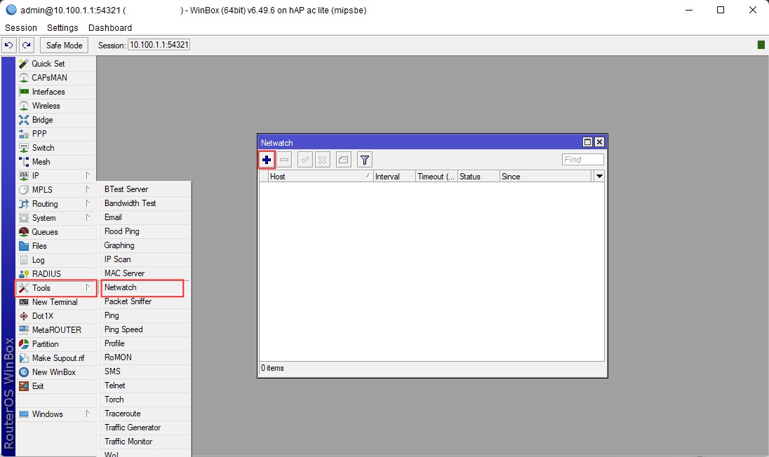 1. Login ke Mikrotik menggunakan Winbox, kemudian pilih menu Tools > Netwatch. Klik Add untuk menambahkan perangkat yang akan kita monitoring.