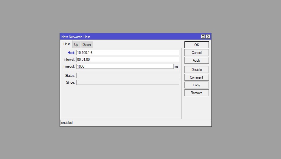 • Host: Alamat IP atau domain yang akan dimonitoring. Netwatch akan melakukan ping untuk mengecek status up atau down.