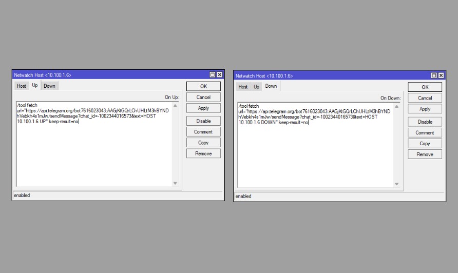 /tool fetch url="https://api.telegram.org/bot(bot_token)/sendMessage?chat_id=(group_chatid)&text=HOST 10.100.1.6 UP" keep-result=no