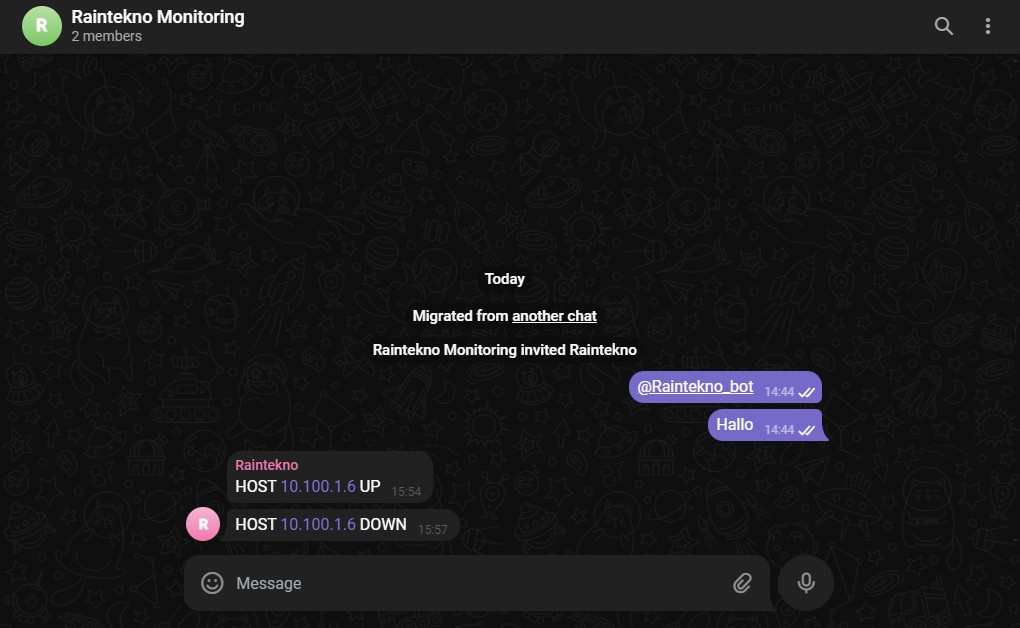 Jika sudah selesai konfigurasi Netwatch di Mikrotik, maka akan muncul notifikasi UP atau DOWN di Telegram seperti berikut.