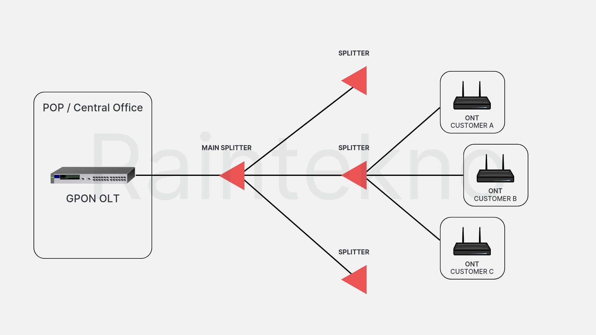 Dalam teknologi ini kita menggunakan perangkat pasif fiber optik berupa splitter untuk distribusi sinyal dari perangkat OLT (Optical Line Terminal) di PoP (Point of Presence) hingga ke beberapa perangkat ONT yang berada di customer.