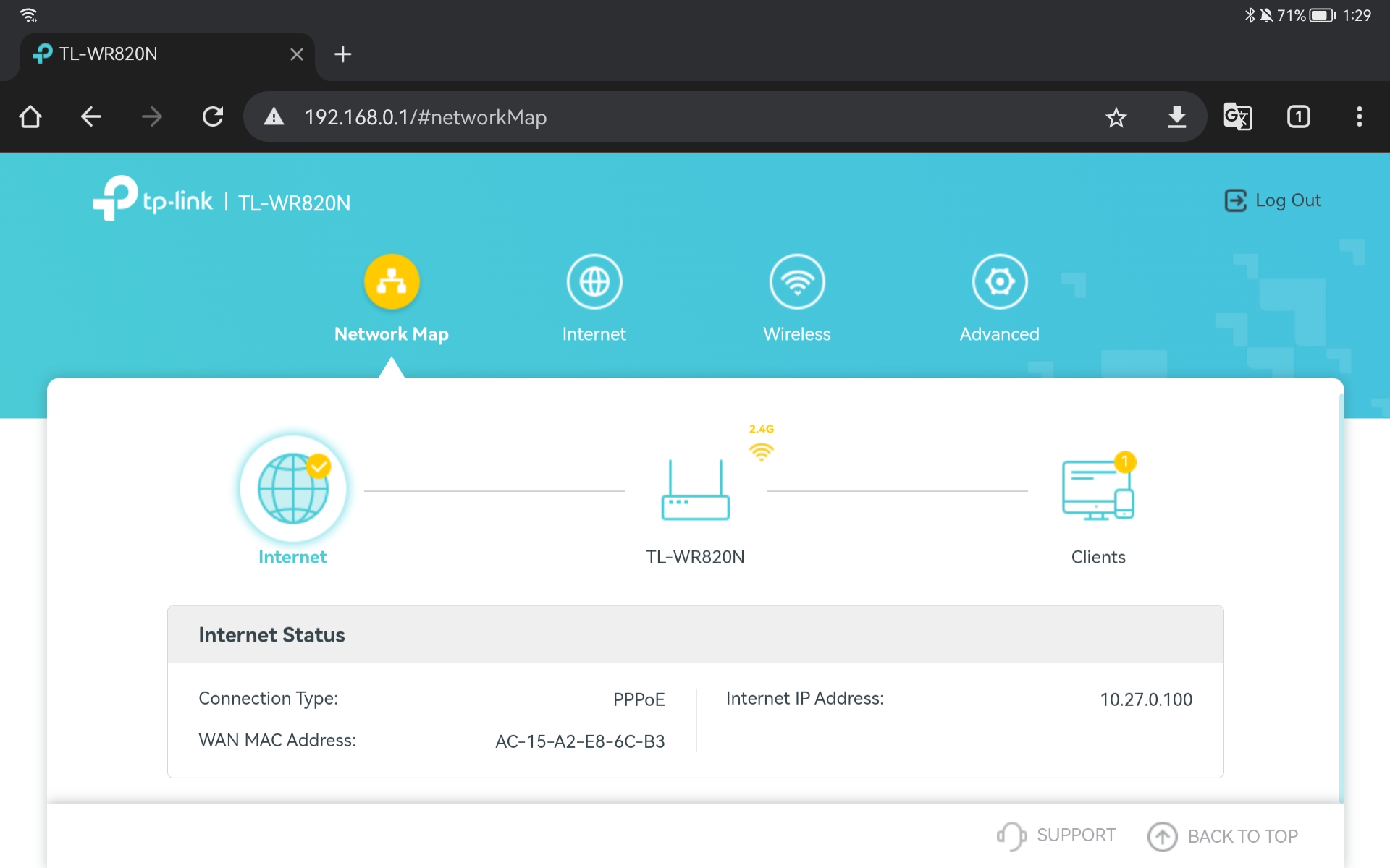 9. Sampai pada tahap ini seharusnya hp yang terhubung ke TP-Link sudah mendapatkan akses internet. Untuk memastikan login kembali ke halaman web TP-Link TL-WR820N. Disini sudah terlihat Access Point sudah terhubung ke Internet.