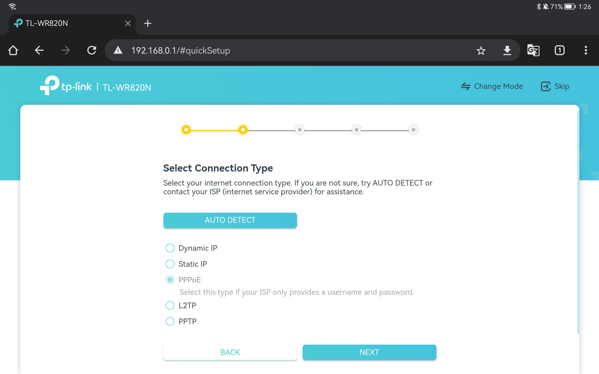 4. Pilih tipe koneksi PPPoE dan klik Next.