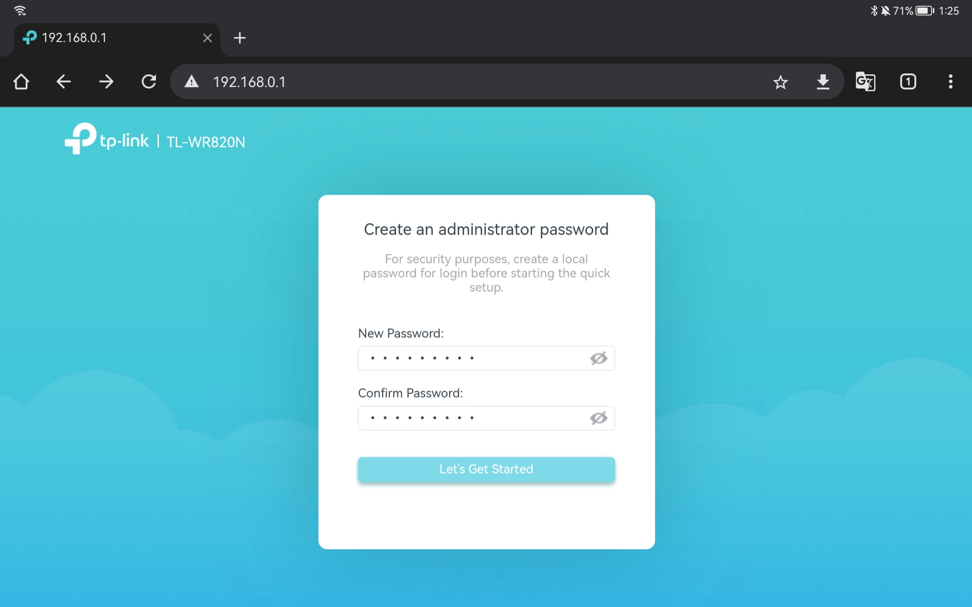 2. Buka aplikasi Google Chrome, masukkan alamat IP 192.168.0.1 dan buat password baru untuk login ke Access Point. Jika sudah klik Let’s Get Started.